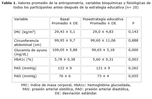 La tabla 1 muestra los valores antes-después del IMC y del perímetro abdominal, que permanecieron en rangos de obesidad y adiposidad centrípeta al finalizar el estudio. Tampoco se modificaron las cifras de presión arterial, pero en la glucemia capilar de ayuno y HbA1c hubo disminución de los valores finales, con respecto a la medición inicial p= 0,000 y p= 0,003 respectivamente.